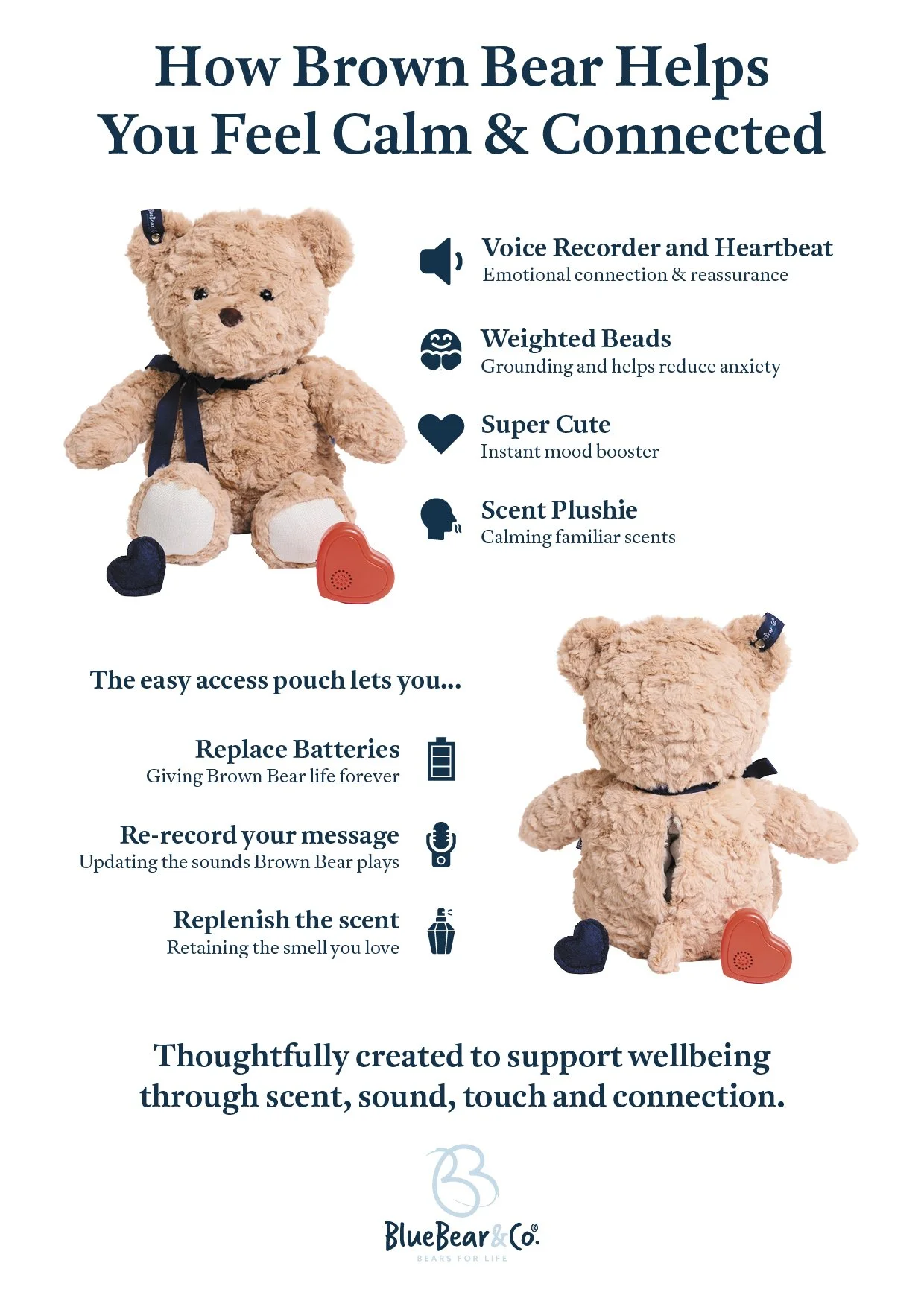 Blue Bear & Co. teddies are intentionally designed with a mix of tactile features , luxuriously soft fur, textured ribbons, ear labels and a gentle heartbeat to mimic a real hug.